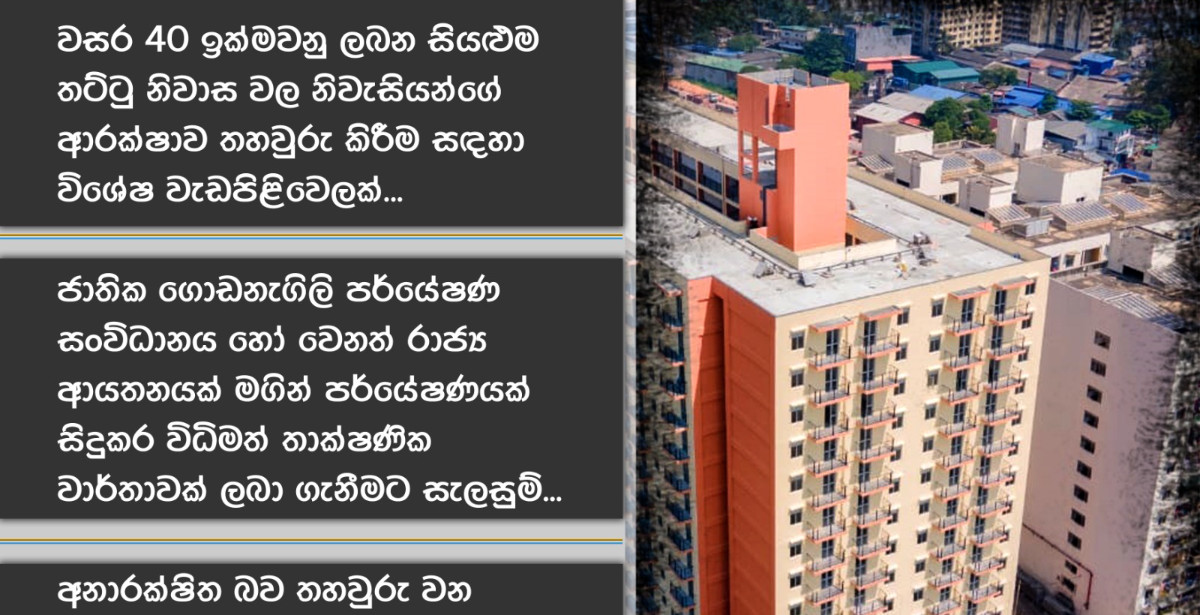 A special program to ensure the safety of residents of all flats that exceed 40 years...Plans to get a formal technical report conducted by the National Building Research Organization or other government agency...Housing complexes that are confirmed to be unsafe will be redeveloped under public-private partnership...Urban Development and Housing Minister Mr. Prasanna Ranatunga advises the authorities to immediately start a special program to ensure the safety of the residents of all flats that e