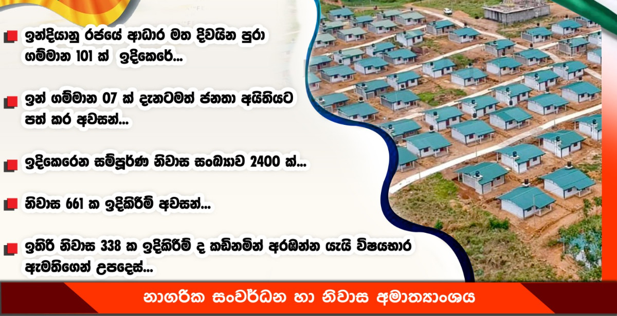 101 villages will be built all over the island with the help of Indian government... Out of which 07 villages have already been handed over to people... The total number of houses to be constructed is 2400... Construction of 661 houses completed... Instruction from subject minister to start construction of remaining 338 houses immediately...According to the National Housing Development Authority, the construction work of 1401 houses in 101 villages across the island is currently
